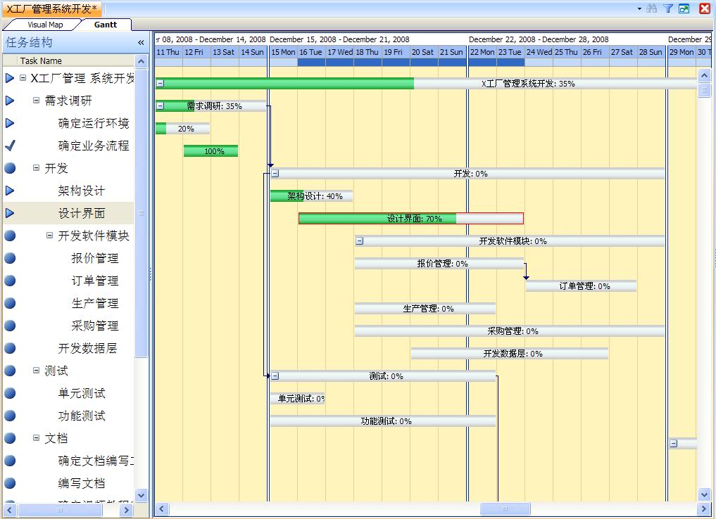 更重要的是:MindVisualizer 可以智能的根据任务之间的依赖关系自动安排任务的日程,如任务B必须任务A结束后才能开始,则任务B的开始时间会被自动调整到任务A结束之后。参考下面的甘特图例子。